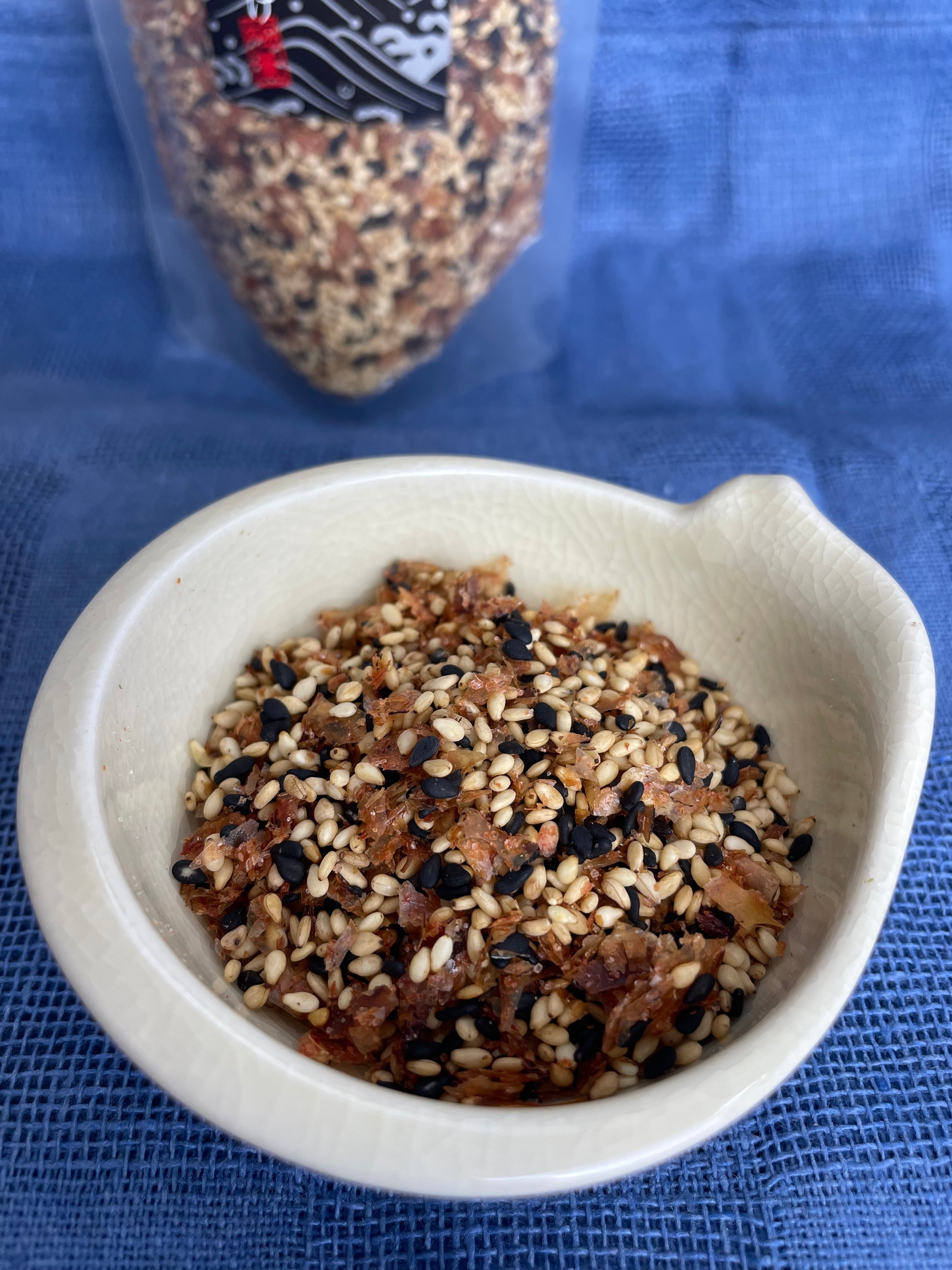黒いり胡麻、鯖削り節、食塩、醤油、澱粉、調味料(アミノ酸等)、甘味料(甘草、ステビア)、卵殻カルシウム、酸化防止剤(V,E)、(一部に乳成分・小麦を含む)